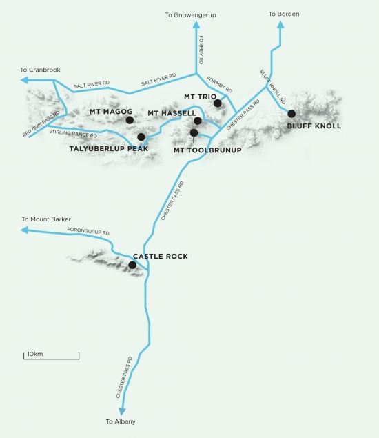 Regardless of which climb you’ve chosen to do for the day, on the drive south, you’ll see most of the options laid out before you as the Stirling Range fills your windscreen. By numbers alone, these mountains aren’t that impressive. At 1100 meters above sea level, Bluff Knoll, the highest peak, isn’t even Western Australia’s highest mountain. But numbers can be deceiving, and it’s the topographic prominence of over 800 metres that gives this range its towering presence. Bluff Knoll looks over the surrounding country like an impassive grey sentinel with a dark green cloak pulled around its shoulders. The Goreng Noongars of the plains, who wore kangaroo skin cloaks around their shoulders in the winter months, called it Bular Mial, which means “many eyes”: an ancestral being, watching over all.