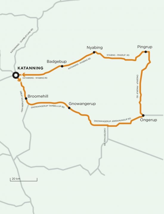 We head south-west through the southern end of the Chinocup lake system and the Willoughby nature reserve before swinging west towards Nyabing, through the vast crops of the southern Wheatbelt. This is farming on a massive scale. In early winter or early summer, you might be lucky enough to see some of the mammoth headers and seeders that are now used to cultivate this semi-arid land.